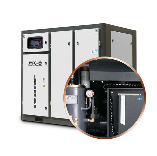 JUCAI螺桿空壓機主機,大轉子低轉速設計,采用先進的螺旋齒型技術,瑞典原裝進口SKF圓錐滾柱軸承,噪音低,能耗低。