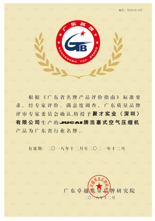喜訊——根據(jù)《廣東省名牌產(chǎn)品評價指南》標(biāo)準(zhǔn)要求,在企業(yè)自愿申報的基礎(chǔ)上,經(jīng)申報資料初審、審報數(shù)據(jù)公示、企業(yè)現(xiàn)場審查、專家綜合評價、廣東質(zhì)量品牌評審專家委員會審議確認(rèn),授予聚才實業(yè)(深圳)有限公司生產(chǎn)的“JUCAI聚才”牌活塞式空氣壓縮機(jī)等系列產(chǎn)品為2018年度廣東省行業(yè)類名牌,有效期三年。
